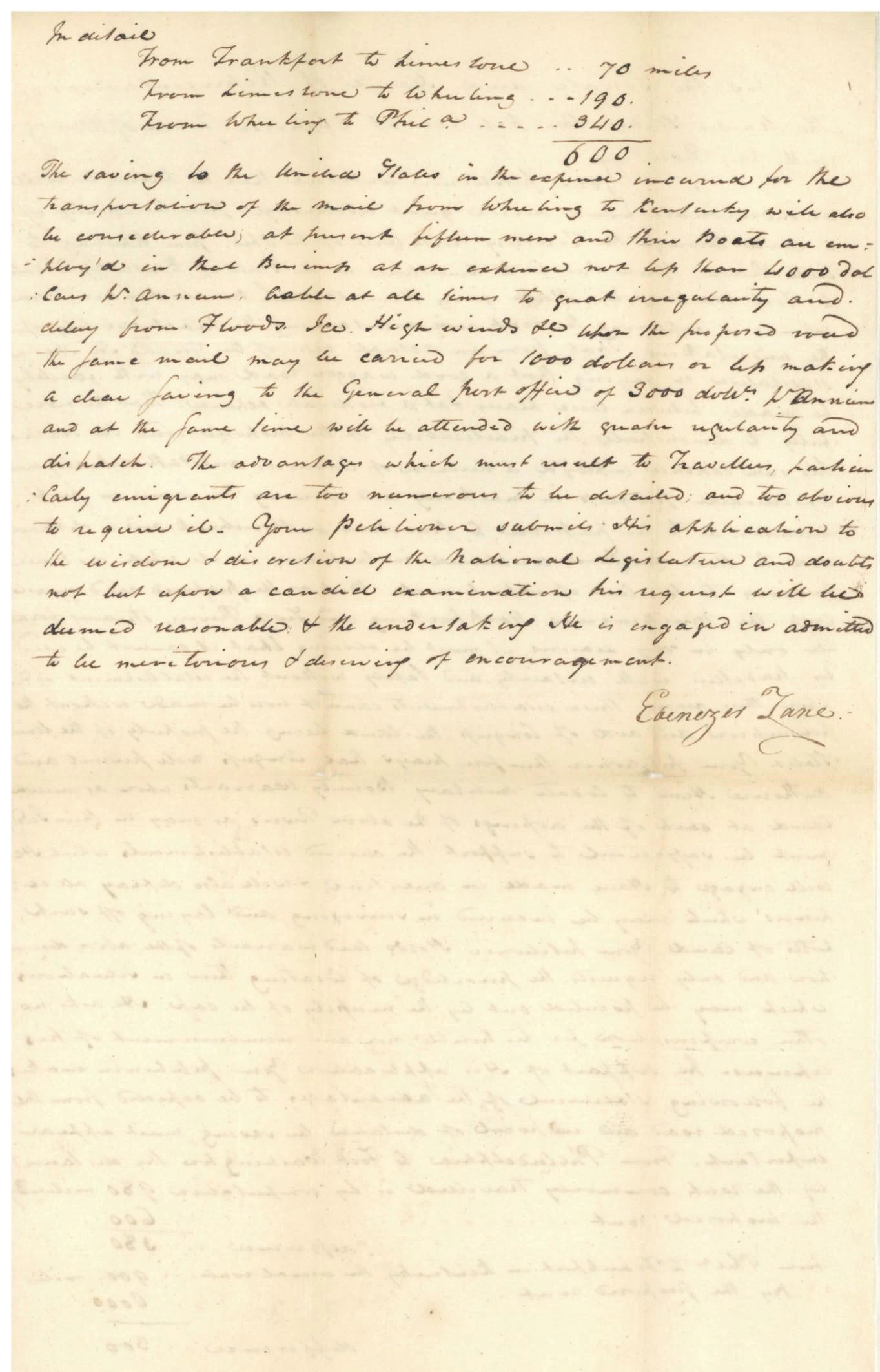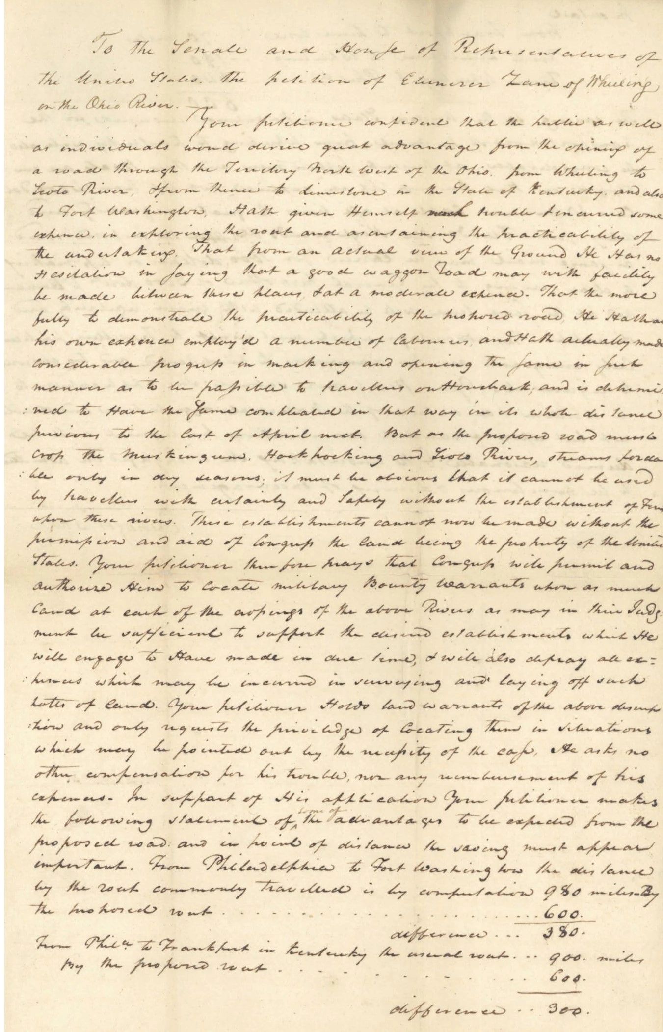 In 1796, Zane petitioned Congress to allow him to build a road with appropriate ferry crossings from Wheeling Virginia (West Virginia) to Limestone (Maysville) KY and pay him in land. Zane pointed out the savings in time and cost of delivering mail by land, showing a potential savings of 75%. He also pointed out the great "advantage to the public as well as individuals" further saying "The advantages which must result to travelers, particularly emigrants are too numerous to be detailed; and too obvious to require it." After being referred to committee, and read before congress three times, an "Act to Authorize Ebenezer Zane to locate certain lands in the Territory of the United States, North West of the River Ohio" was passed on 17 May 1796.